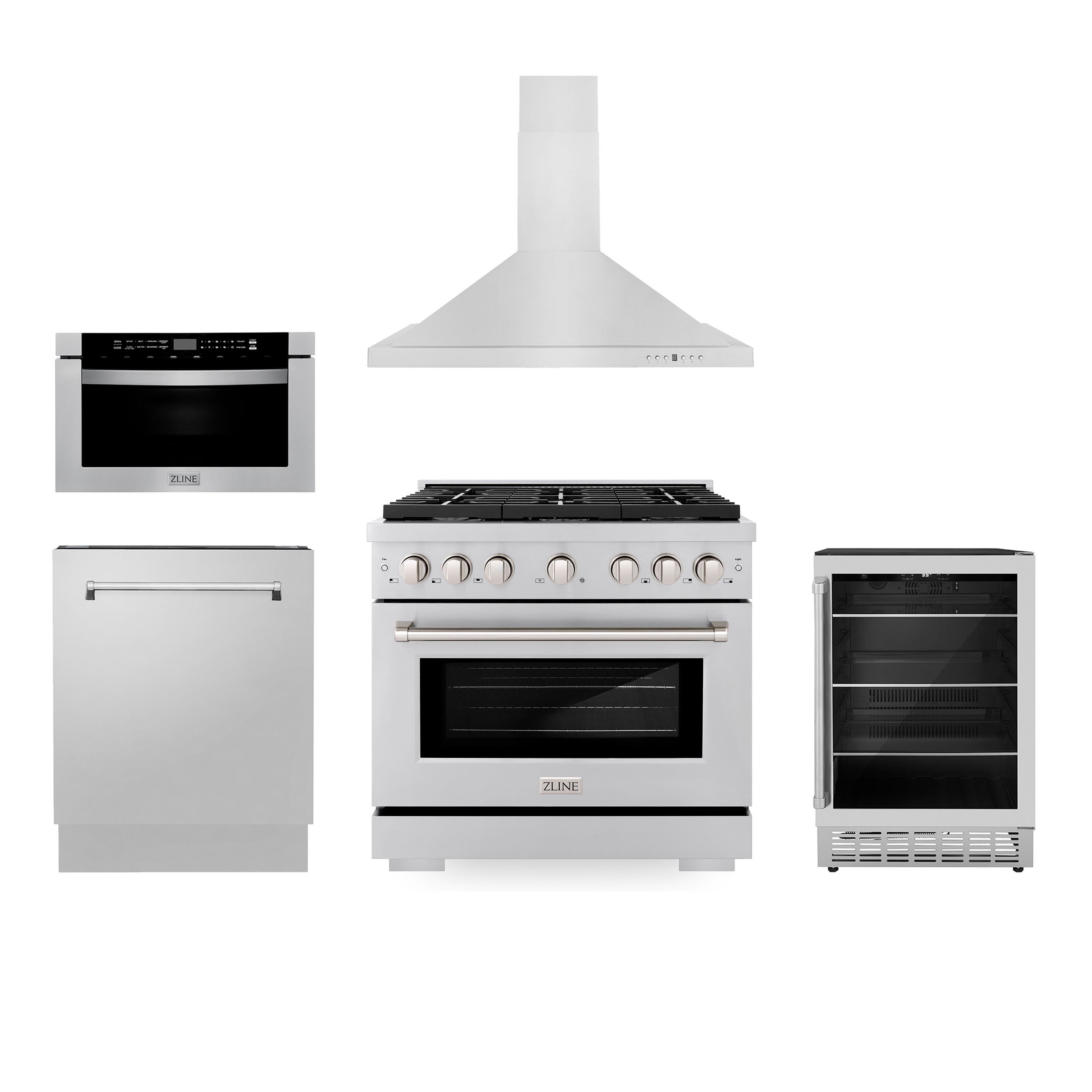 ZLINE 36" Kitchen Package with Stainless Steel Gas Range, Range Hood, Microwave Drawer, Tall Tub Dishwasher and Beverage Fridge (5KP-SGRRH36-MWDWV-RBV)