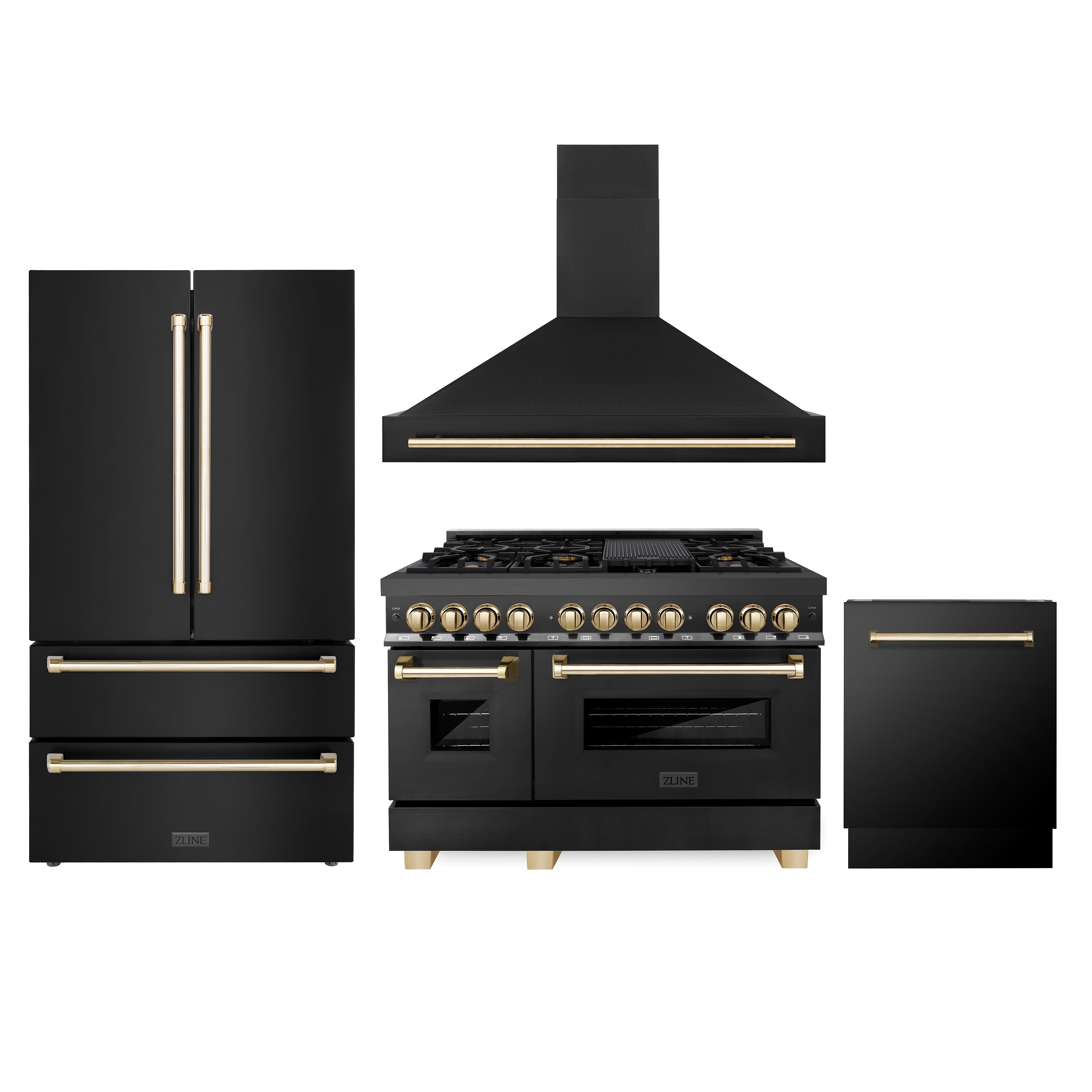 Shop Attainable Luxury with the ZLINE Kitchen and Bath Kitchen Appliance Package - featuring ZLINE Autograph Edition 48" 6.0 cu. ft. Dual Fuel Range with Gas Stove and Electric Oven in Black Stainless Steel with Gold Accents (RABZ-48-G), 48" Black Stainless Steel Range Hood with Gold Accent Handle (BS655Z-48-G), 24" 3rd Rack Top Control Tall Tub Dishwasher in Black Stainless Steel with Gold Accent Handle, 51dBa (DWVZ-BS-24-G) and 36" 22.5 cu. ft Freestanding French Door Refrigerator with Ice Maker in Fingerprint Resistant Black Stainless Steel with Accents (RFMZ-36-BS-G). Save more on your dream kitchen when you bundle. Free shipping on all orders.