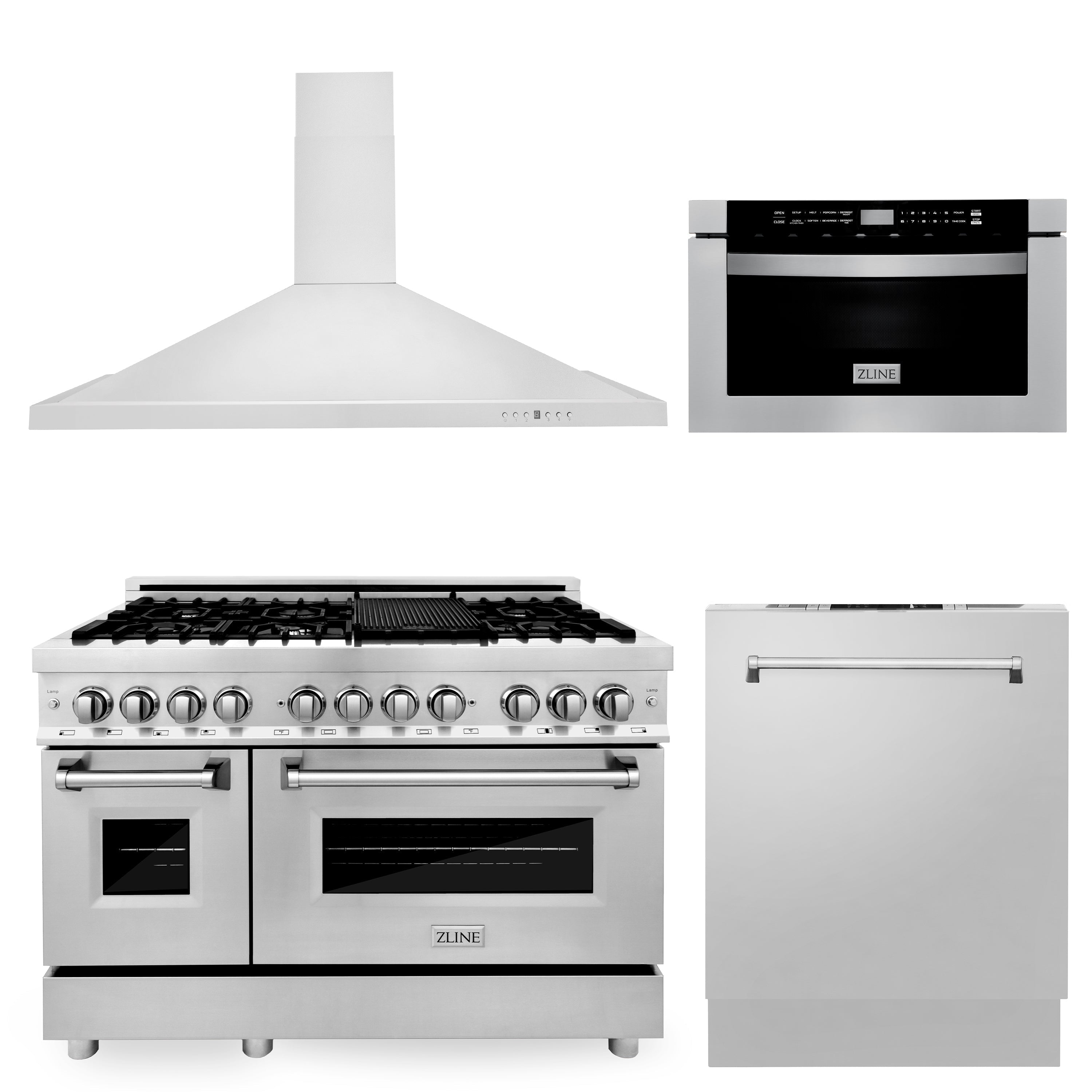 ZLINE 48 in. Kitchen Package with Stainless Steel Dual Fuel Range, Range Hood, Microwave Drawer and Dishwasher (4KP-RARH48-MWDW)