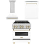 ZLINE Autograph Edition 30 in. Kitchen Package with Stainless Steel Dual Fuel Range with White Matte Door, Range Hood and Dishwasher with Polished Gold Accents (3AKP-RAWMRHDWM30-G)