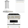 ZLINE Autograph Edition 36 in. Kitchen Package with Stainless Steel Dual Fuel Range with White Matte Door, Range Hood and Dishwasher with Polished Gold Accents (3AKP-RAWMRHDWM36-G)