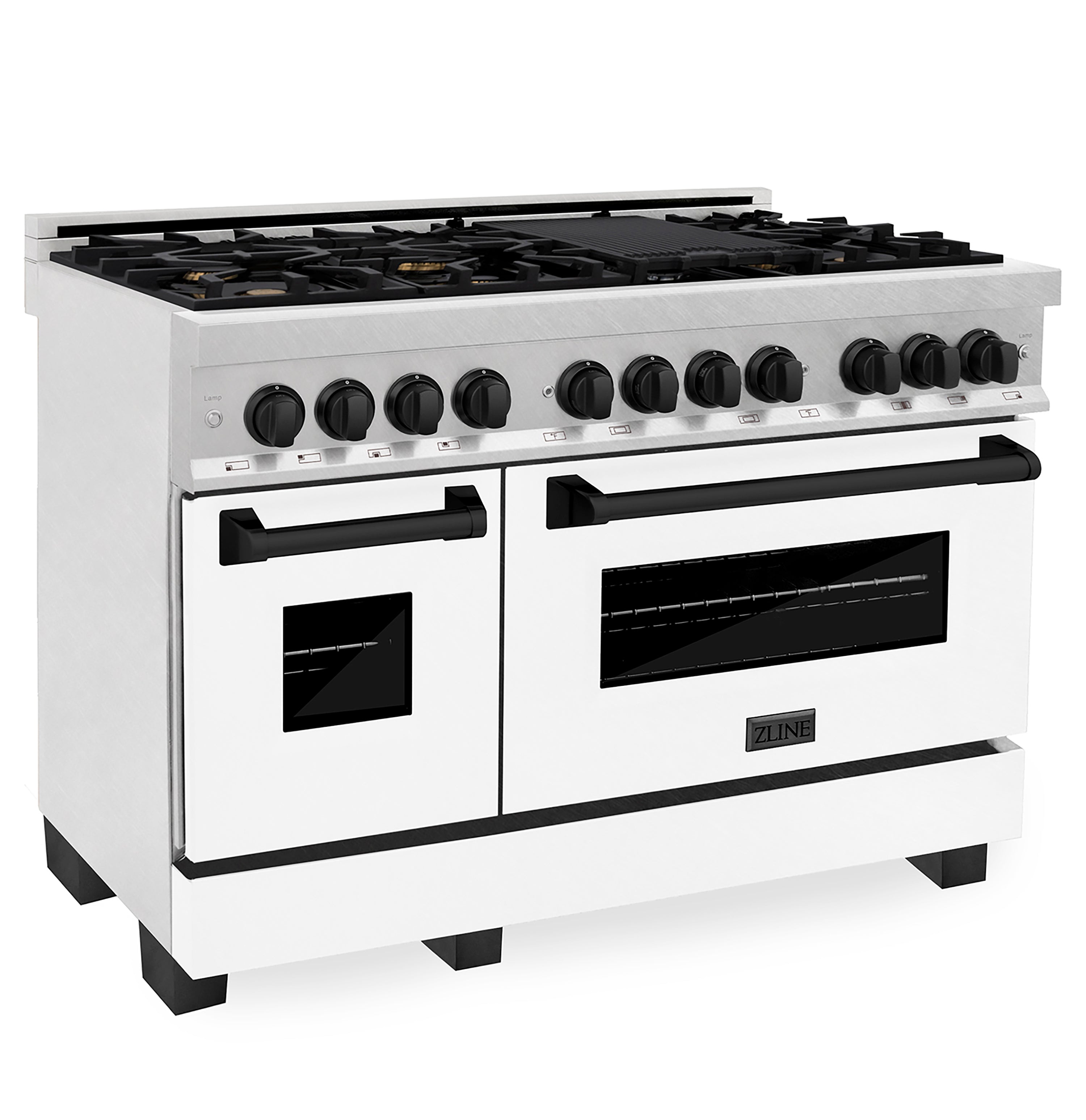 Luxury isn’t meant to be left desired — it’s meant to be attainable. The ZLINE Autograph Edition 48 in. 6.0 cu. ft. Legacy Dual Fuel Range with 7 Burner Gas Cooktop and 2 Electric Ovens in Satin Stainless Steel with White Matte Doors and Matte Black Accents (RASZ-WM-48-MB) pairs a powerful gas cooktop with 7 Italian-crafted burners, a large electric convection oven, a small bake and broil oven, beautiful white matte doors with Landscape window designs, and elegant matte black knobs and handles. With innovative features designed to enhance your kitchen’s capability, ZLINE Legacy Dual Fuel Ranges provide a professional culinary experience by pairing unmatched performance with timeless style.